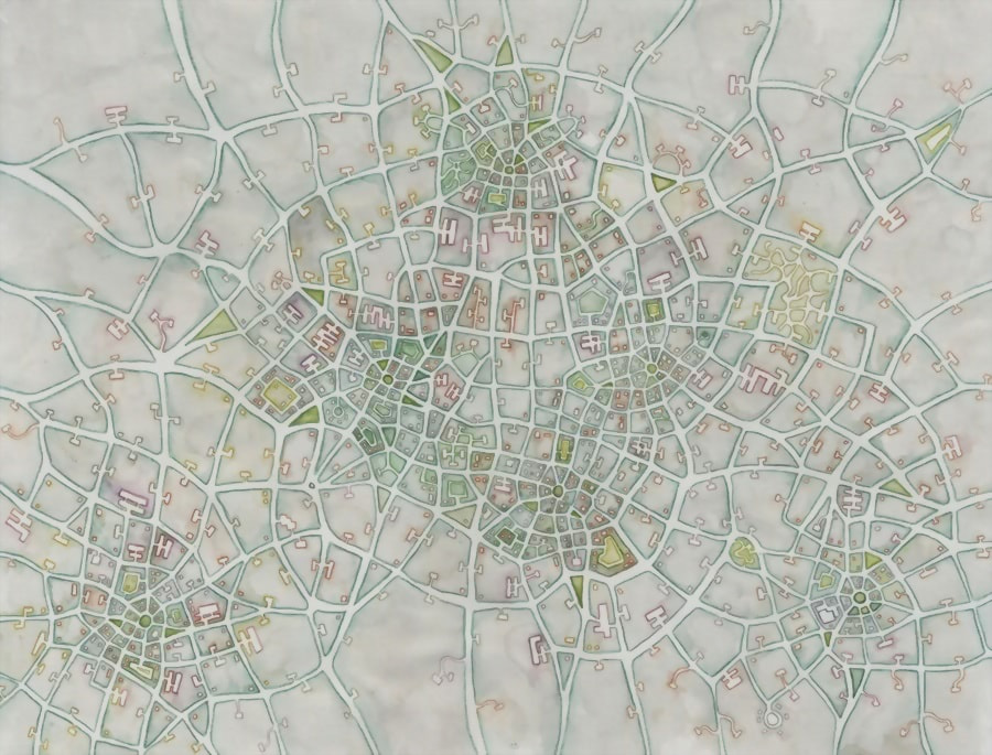 There is also a small display in the vault of a new direction for me: digital collages of older map drawings, sketches and photographs from my various travels over the years. These composites add a narrative and textural element to my mapmaking, in an attempt to put some of my thought process on paper. The sketches are from photos I’ve taken in cities around the country, reflecting the show’s concept that these drawings could be of anywhere. They are at the same time personal, distillations of my own internal maps.