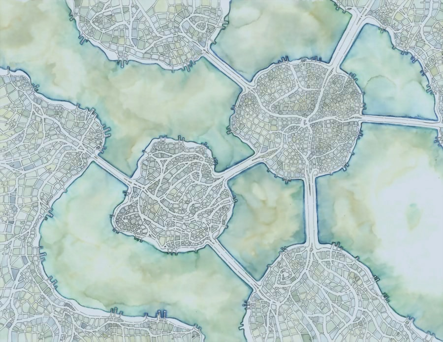 Bloc 11 Cafe in Union Square is currently showing about 50 of my map drawings in a solo exhibition. The show’s title, “Somewhereville”, refers to the way that my maps are of everywhere and anywhere, and also references the connection my work has grown to have with Somerville, where I started my map art career. The show includes a variety of pen and watercolor map drawings from the three years that I’ve been exploring the concept, including three brand-new, never displayed drawings.