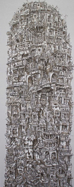 I’m of course a fan of the super dense city drawing style; I was also really intrigued by the way he translated it onto carved sculptural works as well. I’m definitely considering trying out something like that.