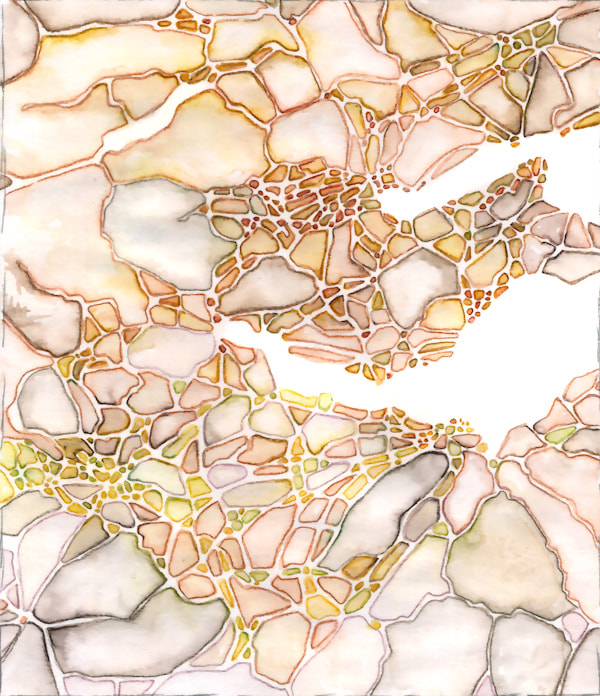 I had my directions for the overall distribution of colors, but within each panel there was a lot of space! Detail that I would have glossed over at the small scale of the color sketch was much more stark at a larger scale. Additionally, when the roads were scaled up they became less apparent. I worked on subtly highlighting them using the watercolor strokes, and at the end of the project the lines of the roads got retraced as well.