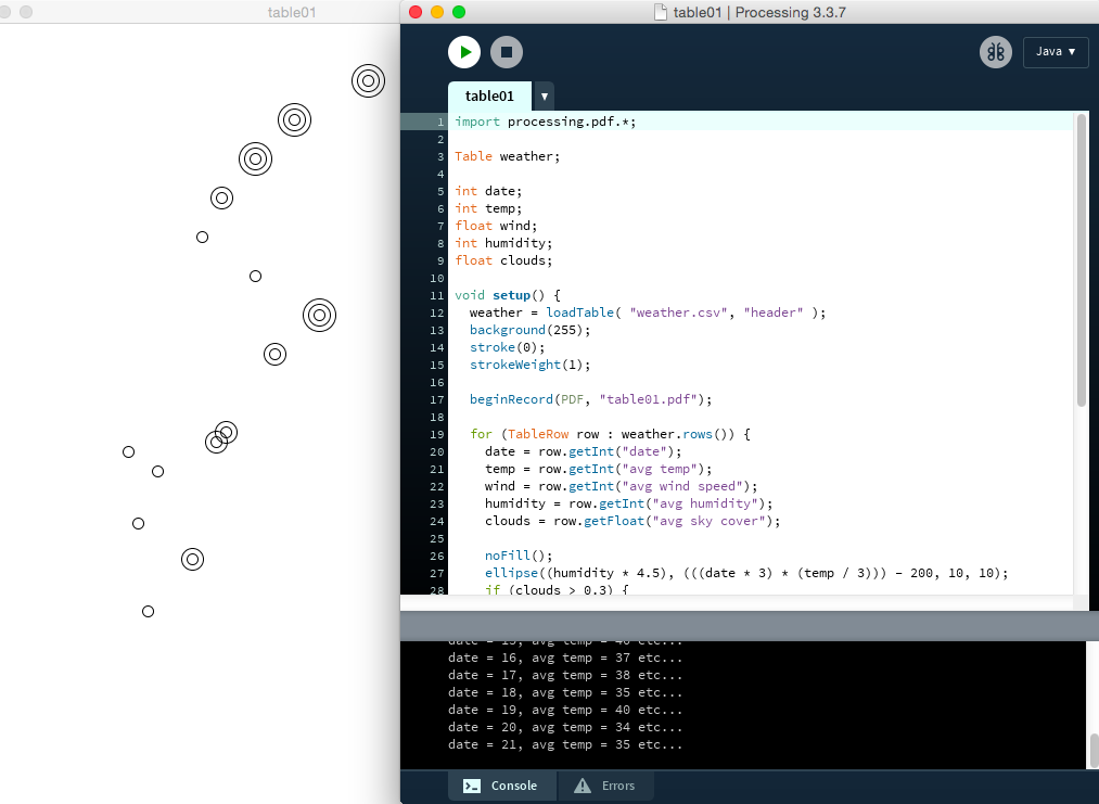 I made some simple plots of the weather data using Processing, comparing humidity and temperature by date and plotting the points as small circles.